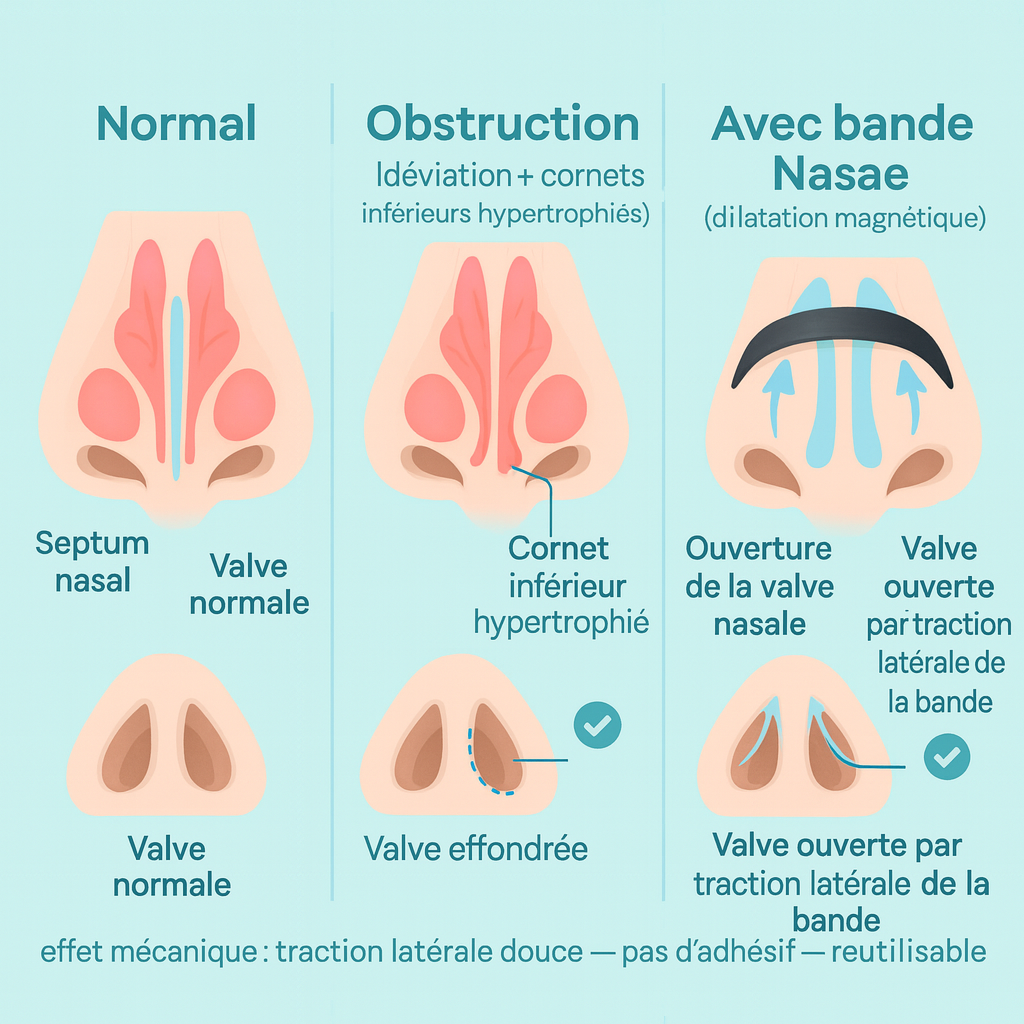 Une fois en place, la tension douce de l’arceau écarte légèrement les ailes du nez et ouvre la valve nasale. La section d’entrée de l’air augmente, ce qui facilite chaque inspiration.